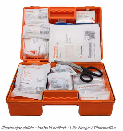 Kofferten er støvtett og utstyrt med det du trenger om uhellet skulle være ute. Den leveres med festebrakett for montering på vegg eller i bil. Alt av utstyr er merket på norsk eller med lettforståelige bilder som forklarer bruk og fremgangsmåte.