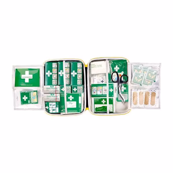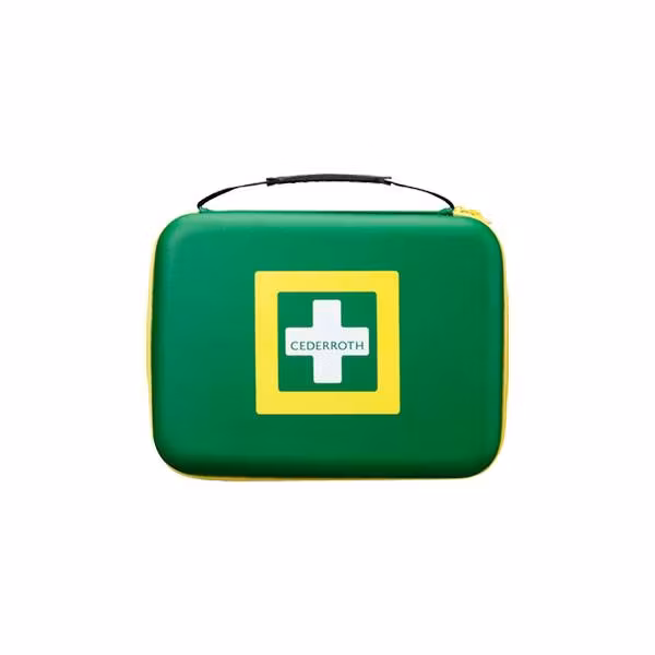 Cederroth First Aid Kit Medium er en Førstehjelpsveske i et slitesterkt gummilignende materiale med matt overflate for å holde støv, fukt og smuss ute. Utrustningen holdes hygienisk ren og er alltid klar til bruk. Produktene er pakket i transparente plastlommer for tydelig oversikt, og det er lett å finne riktig produkt når hvert sekund teller. Alle produkter er utstyrt med tydelige instruksjoner. Signalfarger i grønt og gult gjør vesken synlig på lang avstand. Praktisk håndtak med justerbart borrelåsbånd gjør det enkelt å feste vesken eller bære den med seg.