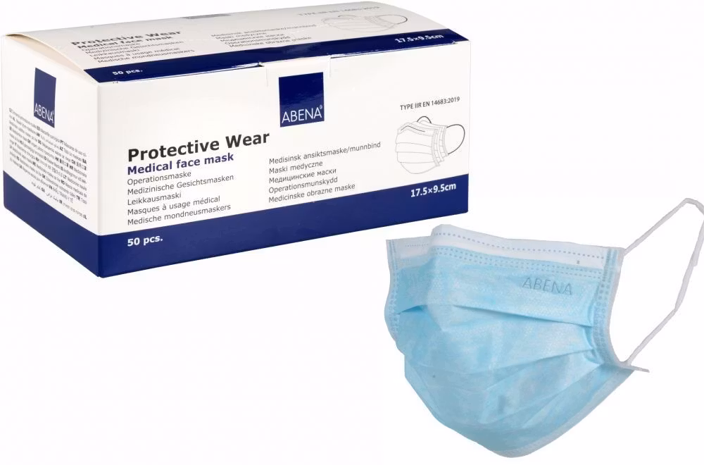 Munnbind, type IIR med ørestrikker, sprut og væskesikker. Abena Excellent. 3-lags. CE-merket. EN14683:2019. Farge: Blå.