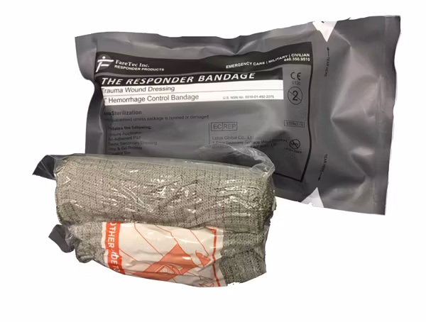 Responder traumebandasje 4"/ enkeltmannsbandasje 10 cm fra Faretec Inc. Bandasjen er vakumpakket med dobbel plast, dvs. at dersom man skulle være uheldig å miste bandasjen når man åpner pakken er den fremdeles steril og innpakket i et nytt plastlag. Det innerste plastlaget kan også brukes som okklusiv bandasje for å behandle en pneumothorax. Pakken er merket med rivestripe. Bandasjen har 5 års holdbarhet fra produsent.